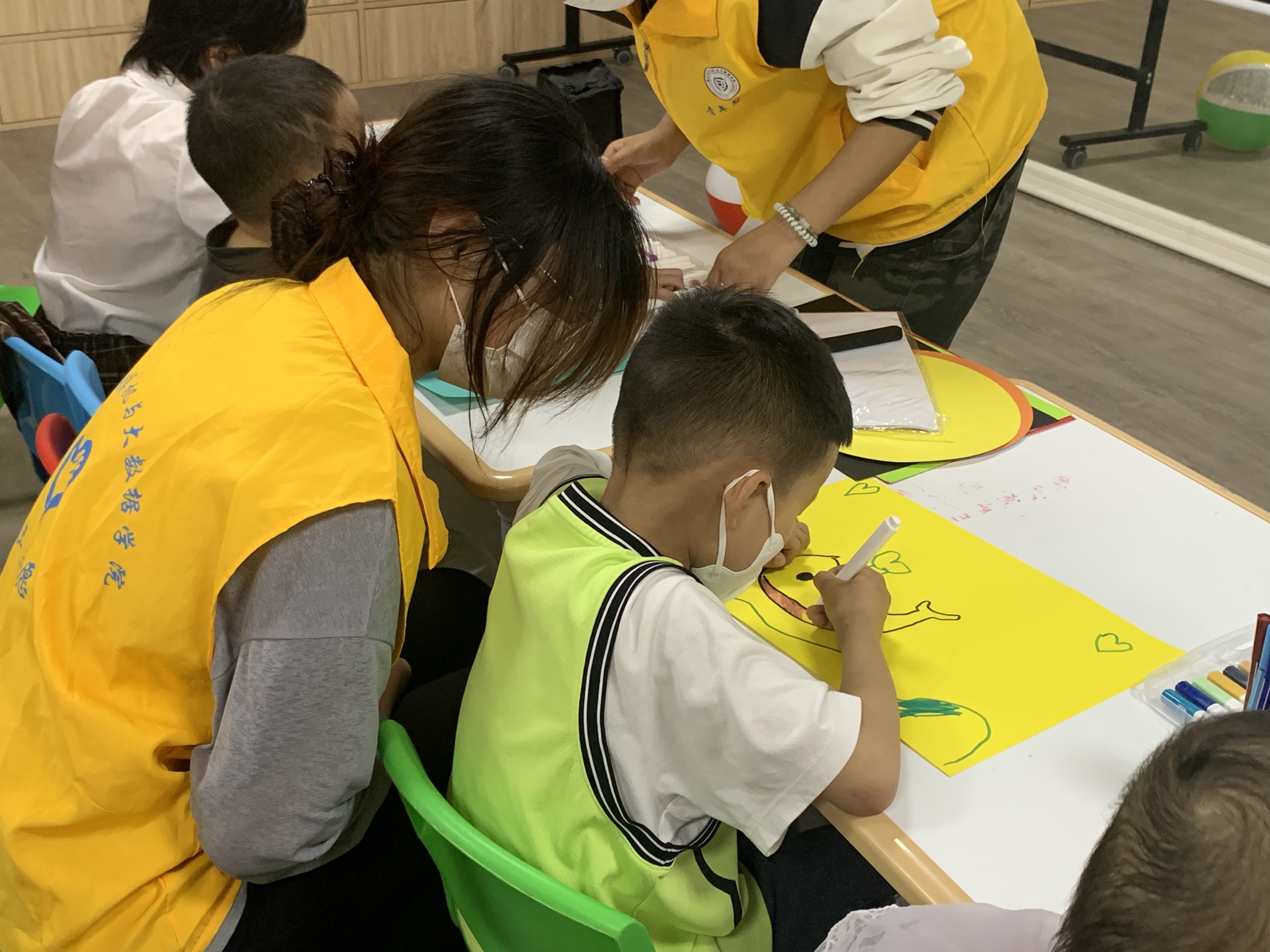 在美术课堂环节,“小朋友们,你们最喜欢的小动物是什么呀,一起画出你最喜欢的小动物好不好呀?”在志愿者老师的鼓励下,孩子们拿起画笔,有的画出了和家人一起幸福生活的小奶猫,有的给小兔子画出了许多漂亮衣服的小兔子。虽然孩子们的手法略显稚嫩,但每一幅作品都充满童真与创意,志愿者们也穿梭在孩子们中间,耐心地给予指导,不时的为孩子们专注的创作给出鼓励的小红花,教室里充满了欢声笑语。